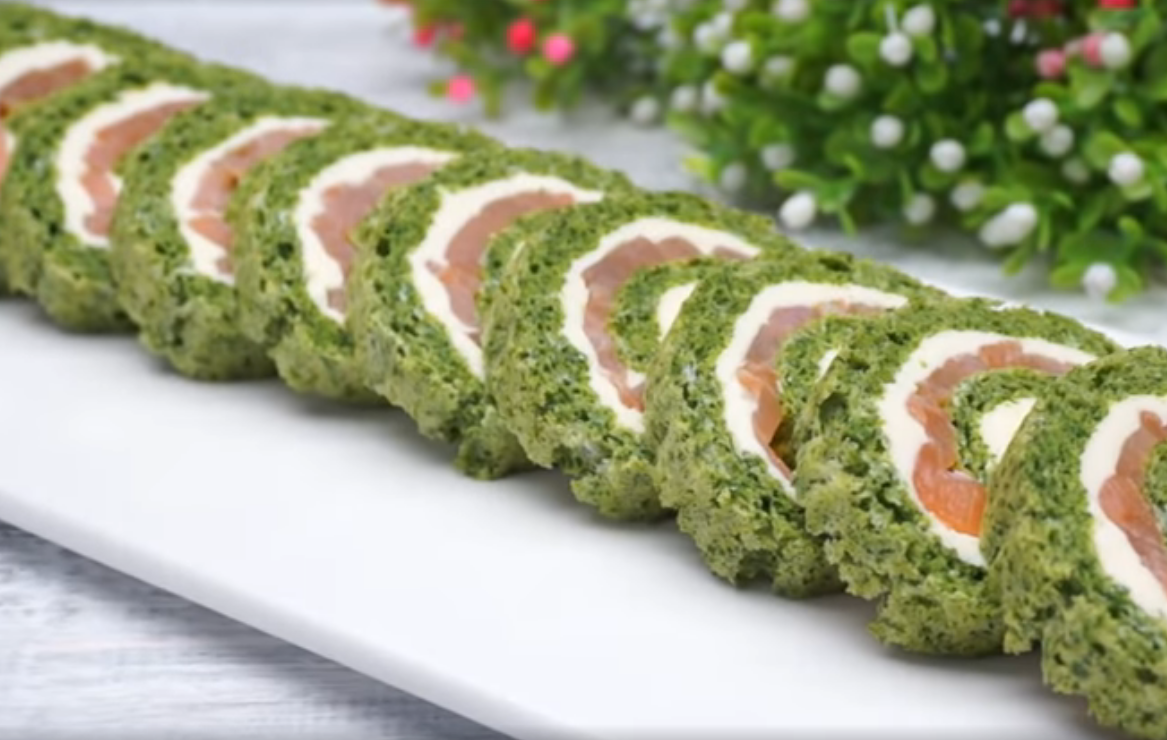 - Аккуратно сверните оба рулета. Старайтесь делать плотно. Туго оберните пищевой пленкой или фольгой. Отправьте в холодильник. Через 3-4 часа царский рулет со шпинатом нарежьте кусочками.