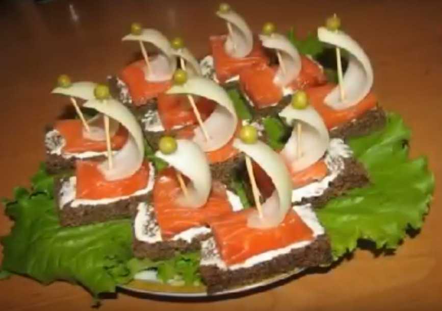 Рецепт пошагового приготовления Из хлебных пластинок вырезать стаканом круглые заготовки под основу и промазать каждую маслом. Семгу нарезать кубиками и выложить на бутерброд. Хрустящий сладкий лук разделить на четверти и разобрать на лепесточки. Они станут парусами будущих корабликов. Луковые лепестки нанизать на зубочистку и украсить угощение зеленым маринованным горошком.