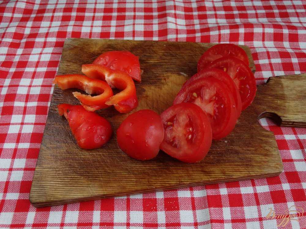 Болгарский перец очищаем и нарезаем мелкой соломкой. Молодой кабачок нарезаем тонкими кружками, аналогично нарезаем помидоры. Чеснок нарезаем пластинками.