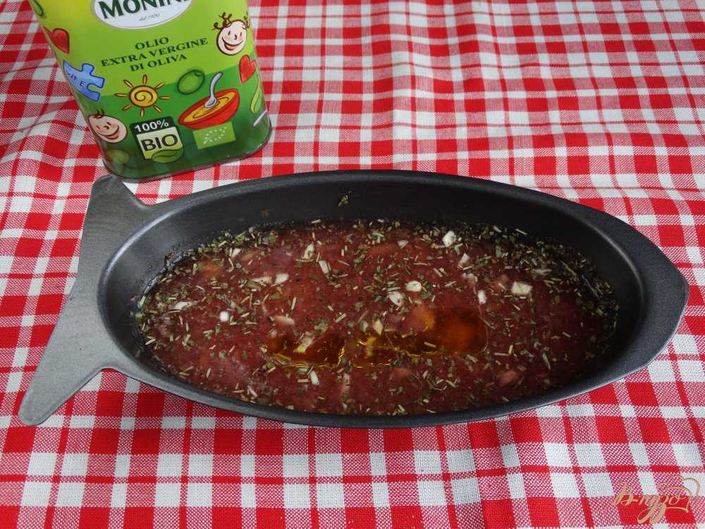 Выливаем томатный соус в форму для запекания, добавляем оливковое масло.
