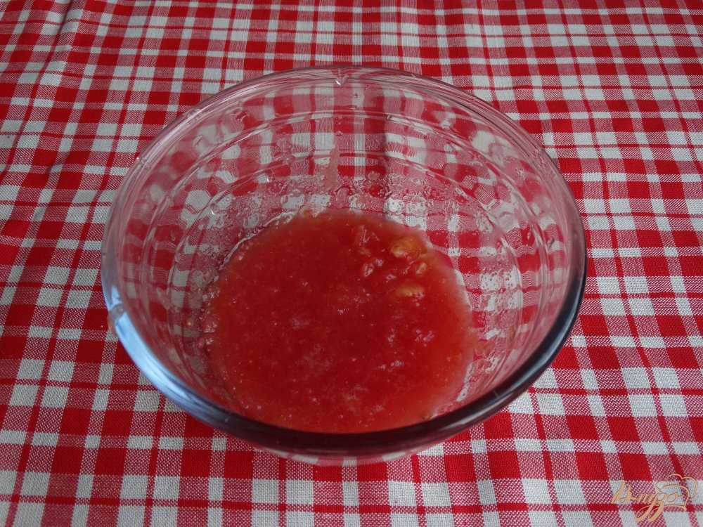 С одного крупного томата снимаем кожуру, мякоть перекручиваем в блендере, выливаем полученное томатное пюре в мисочку.