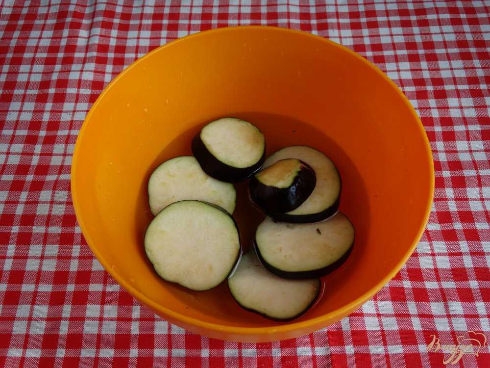 Баклажаны нарезаем кружочками, вымачиваем в соленой воде, чтобы блюдо не горчило.