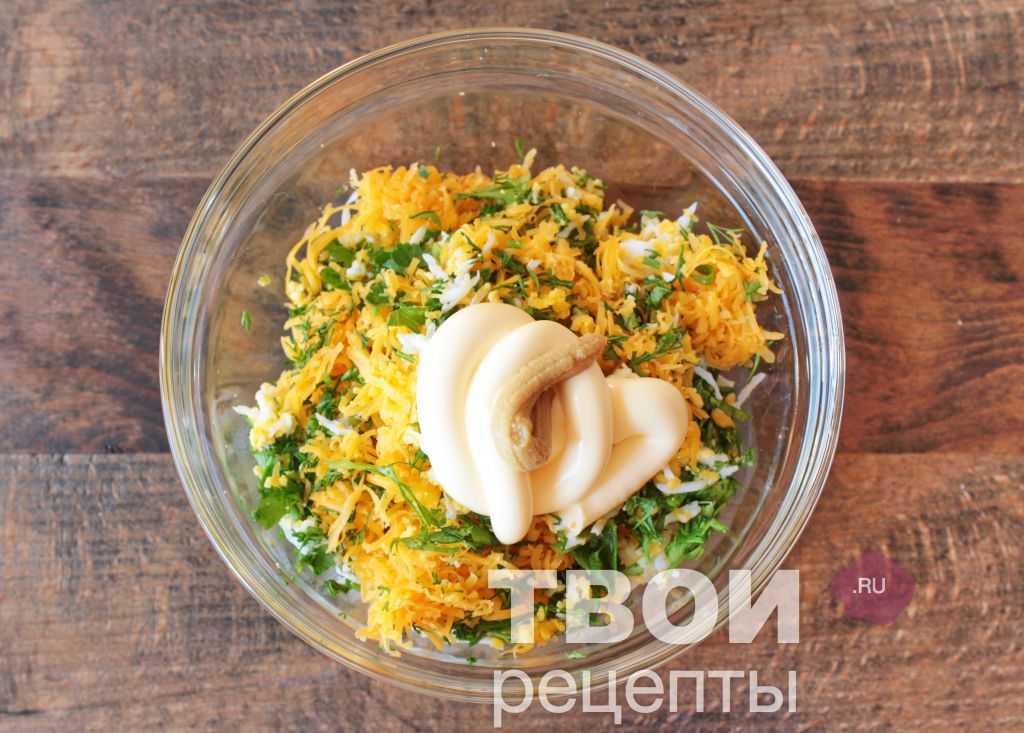 Для начинки: Чеддер и отварные яйца натереть на средней терке, у свежей зелени удалить грубые стебли, листья измельчить, приправить начинку тёртым чесноком, горчицей и майонезом.