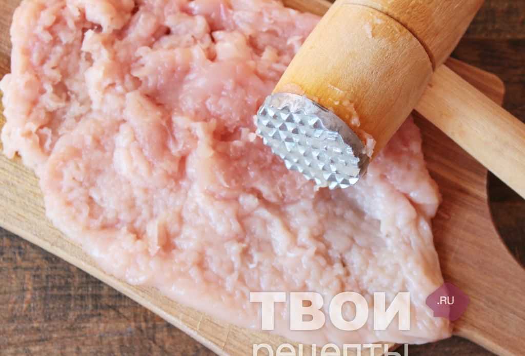 Куриное филе (грудку вместе с вырезкой) отбить с внутренней стороны, стараясь не повредить внешнюю пленку.