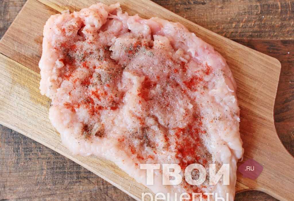 Отправляем их в пакет и осторожно отбиваем специальным молотком. Отбитое филе вынимаем из пакета, посыпаем солью и перцем с двух сторон.