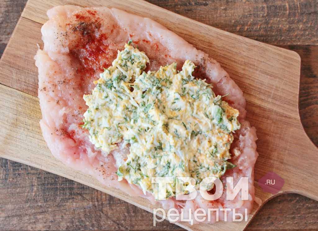 Куриное филе нужно нарезать на плоские широкие куски так, чтобы в них поместилась начинка. По необходимости отбиваем кусочки курицы. Солим и перчим. Берем творог или творожный сыр, намазываем его на каждый кусочек.