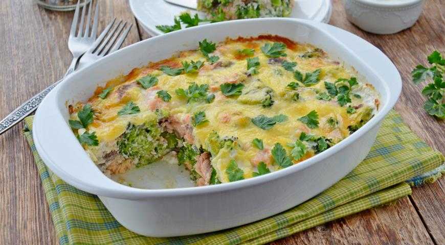 Брокколи заранее разморозить, дать хорошо стечь жидкости поместив для этого в дуршлаге, сделать это можно с вечера. Филе рыбы порезать кусочками. Смешать брокколи, рыбу посолить, перемешивать аккуратно, сложить в форму смазанную сливочным маслом.