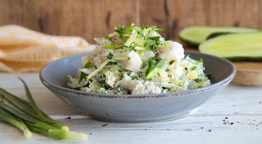Картофель заранее варим в мундире. К 1 литру воды добавляем полстакана огуречного рассола и отвариваем в этой смеси треску. Рыбу охлаждаем, разбираем на небольшие кусочки. Картофель очищаем, нарезаем мелкими кубиками. Соленые огурцы также нарезаем кубиками.