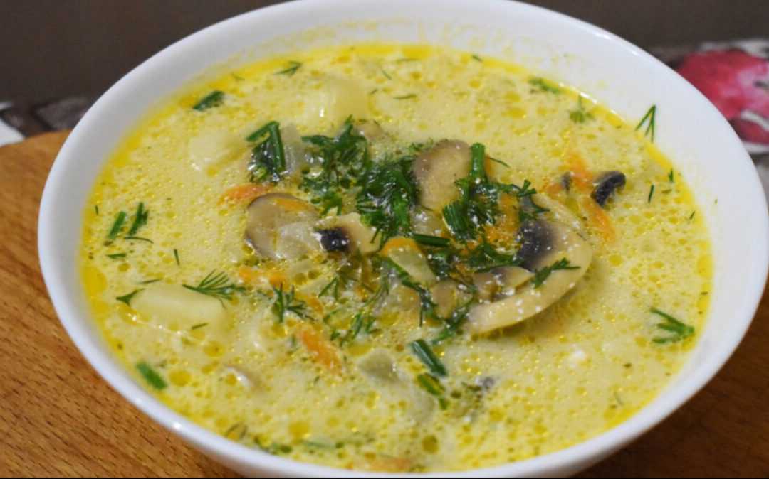 В кипящую подсоленную воду закладываем картофель, варим 5 минут, затем добавляем нарезанные грибы и продолжаем варить ещё 5 минут. Потом закладываем пассерованный лук с морковью, провариваем и в конце кладём плавленый сырок. Хорошо перемешиваем, доводим до вкуса солью, перцем. Наливаем в бульонку и посыпаем зеленью укропа или мелко резанным зелёным луком.