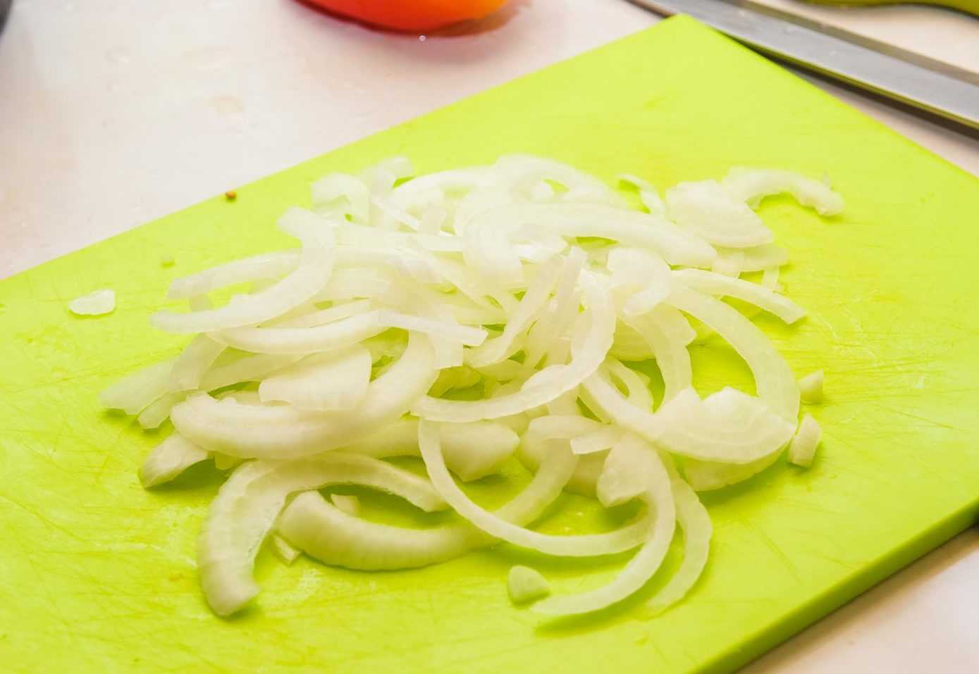 - Удалить шелуху с головки лука, нарубить её полукольцами.