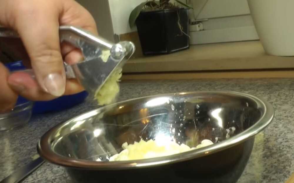 4. Далее очищенный чеснок необходимо измельчить — пропустить через пресс или натереть на терке с мелкими дырочками.