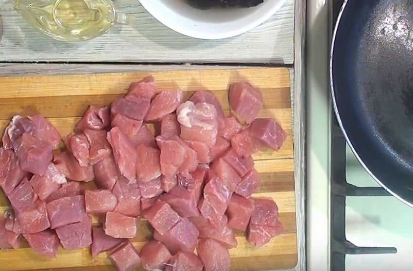 - Мясо хорошо промываем и нарезаем на кубики, просушиваем.