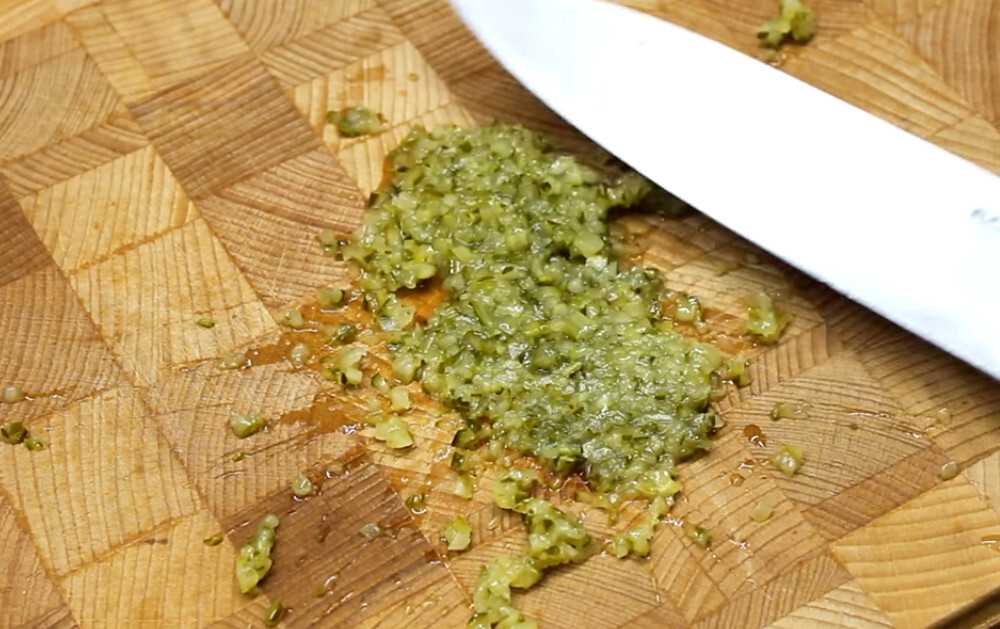 Берем маринованный огурец и измельчаем его ножом, превращая в кашицу.