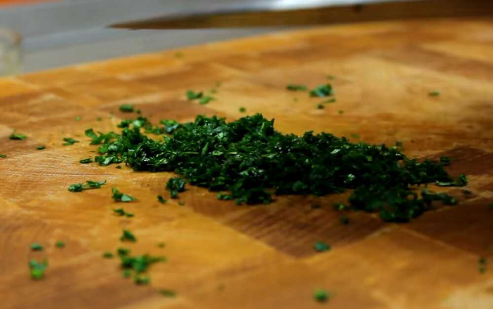 Листья петрушки хорошо промываем и убираем все стебельки. Хорошо их сдавливаем и измельчаем на мелкие кусочки. Старайтесь нарезать как можно мельче.
