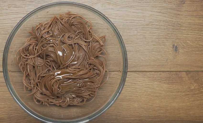 - Когда макароны сварены, откидываем их на дуршлаг и промываем водой, а затем укладываем их на сухари.