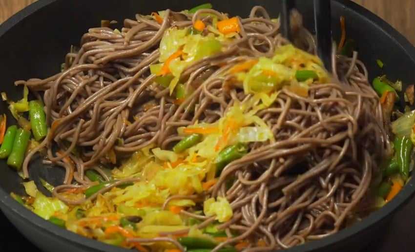 Когда спагетти были готовы, выложила их в сковороду к грибам, снова поставила на огонь и оставила под крышкой на 3 минуты, чтобы паста пропиталась грибным вкусом и соевым соусом.