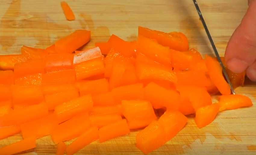 - Накрыть крышкой и обжарить в течение 7 минут, затем, перемешать и готовить в открытом виде для испарения жидкости. Нашинковать грибные ножки кольцами, морковку и лук – кубиками.