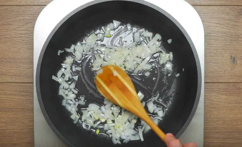 Добавляем порезанный мелким кубиком лук и пассируем еще 2-3 минуты