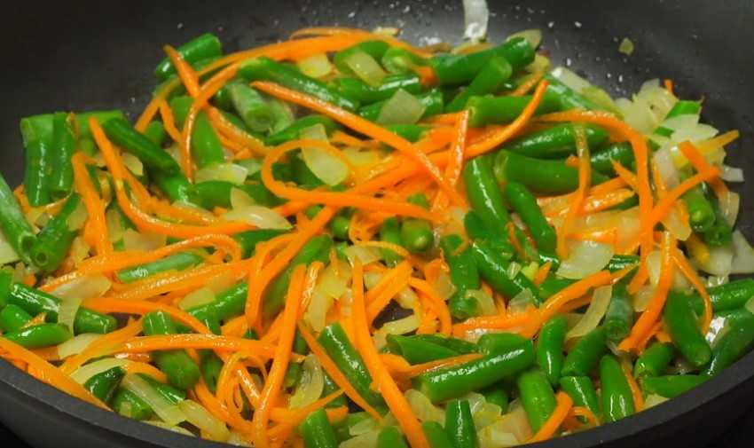 - До готовности жарить на постном масле овощи и ножки, периодически их помешивая.