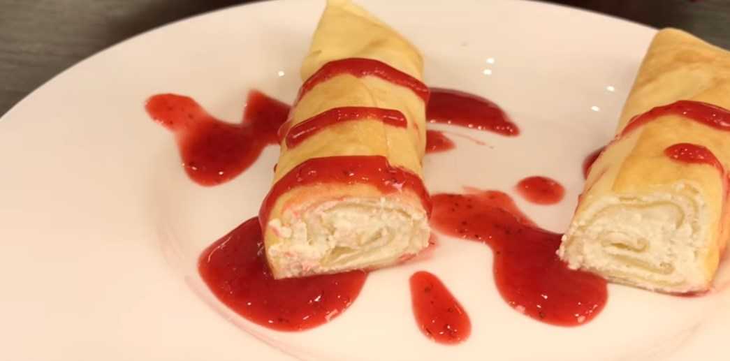 - Кладем массу на жареные блины и сворачиваем их в рулет.