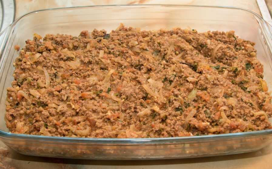 На баклажановы слой выложить половину мясной начинки. Потом снова слой оставшихся баклажанов.