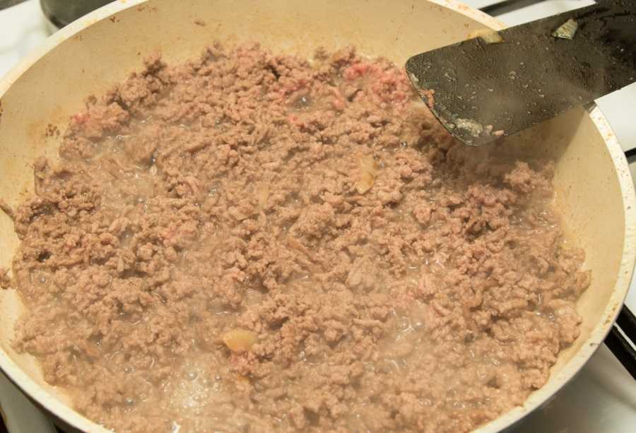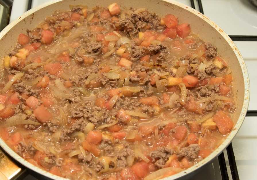 Очищенный и мелко нашинкованный репчатый лук выкладывают на разогретую сковороду. С появлением золотистого цвета к луку добавляют фарш, тщательно перемешивают и продолжают жарить. Когда мясо начнет пускать сок, его приправляют специями и заливают вином и водой. Мясную составляющую оставляют тушиться до испарения жидкости. |