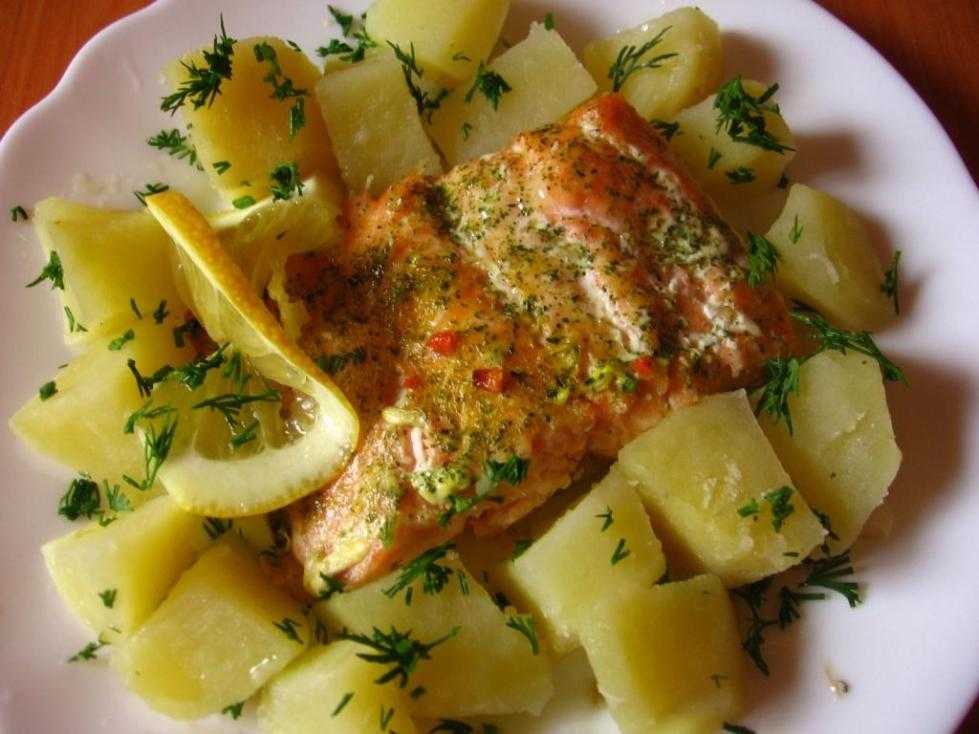 Затем добавить всю норму сливочного масла, посолить, закрыть кастрюлю крышкой и хорошо встряхнуть несколько раз. Масло должно распределиться по всему уже сваренному картофелю. Далее вымыть зелень, нашинковать и посыпать сверху. Медленными движениями перемешать зелень с картошкой и дать постоять под закрытой крышкой около десяти минут. Кстати, зелень может быть использована любая по личному выбору. Простой гарнир к запеченной рыбе готов. Соединить на порционных тарелках картофель и рыбу, подать к столу. Просто, вкусно и сытно. Это прекрасный вариант блюда на обед или ужин.