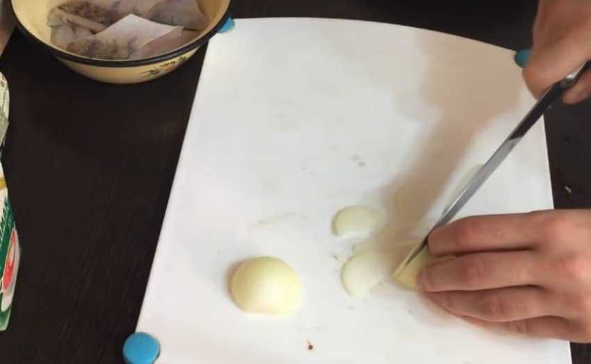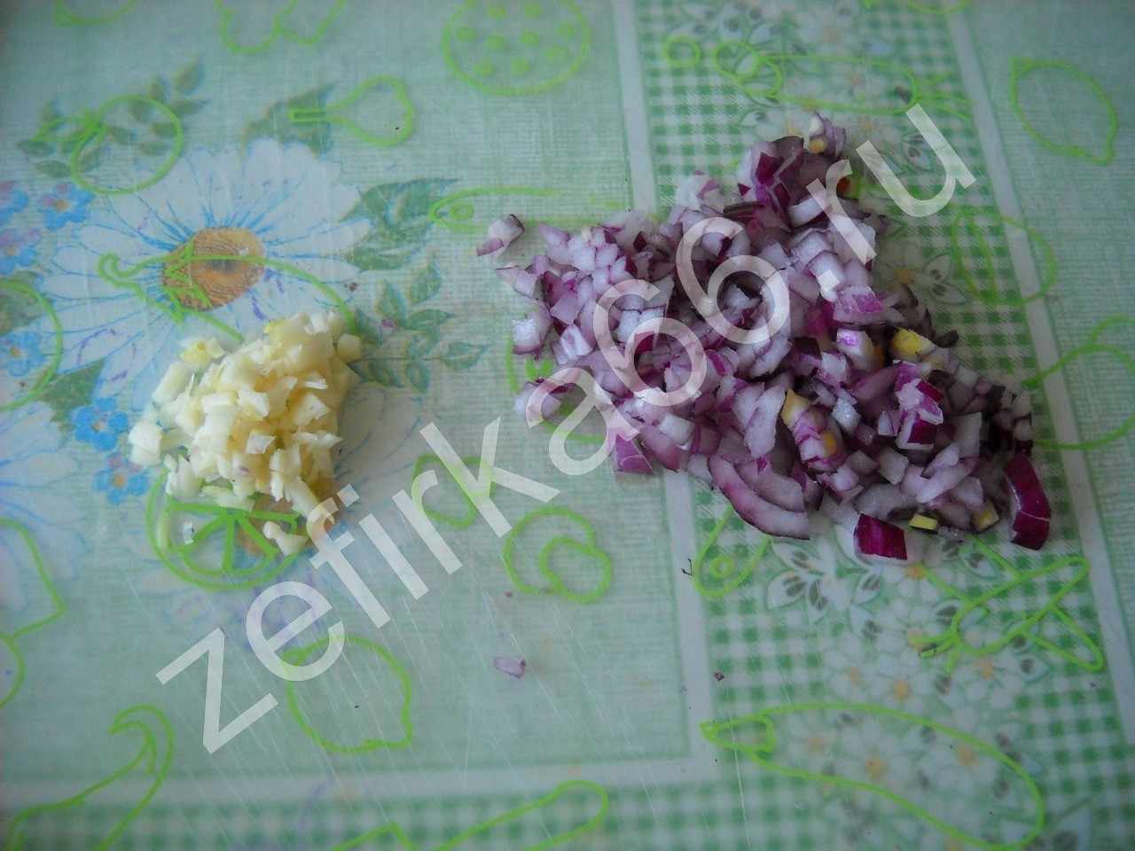 Мелко рубим чеснок, лук – чуть крупнее. Можно нарезать лук кольцами или полукольцами, все зависит от вашего желания.