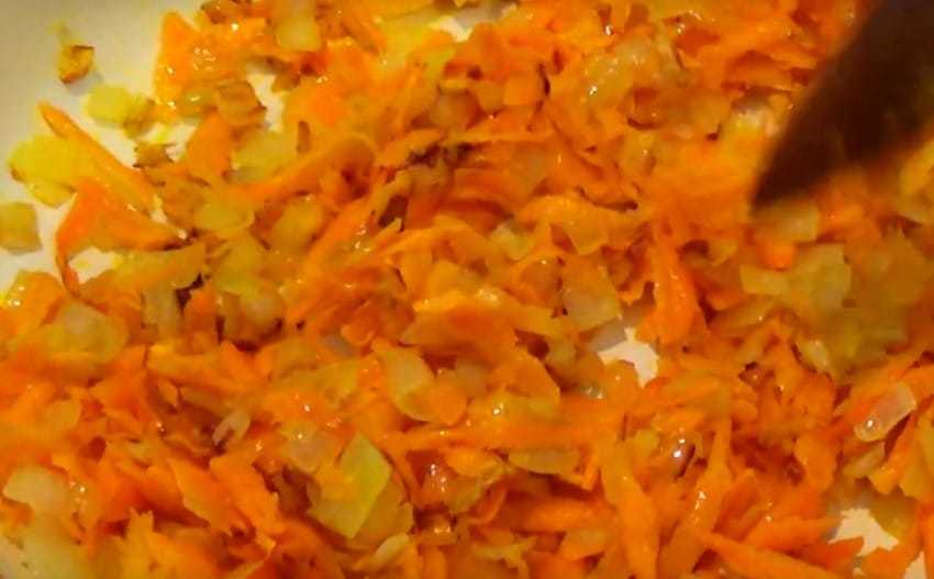 - Пока суп варится, подготовьте и пассируйте лук с морковью, добавьте их в суп.