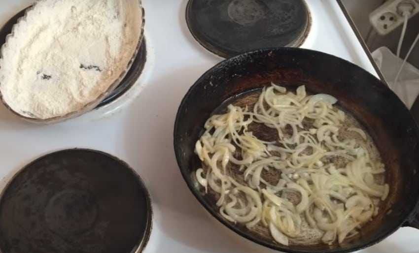 7. В сковороду долейте немного растительного масла и обжарьте лук до легкого золотистого оттенка.