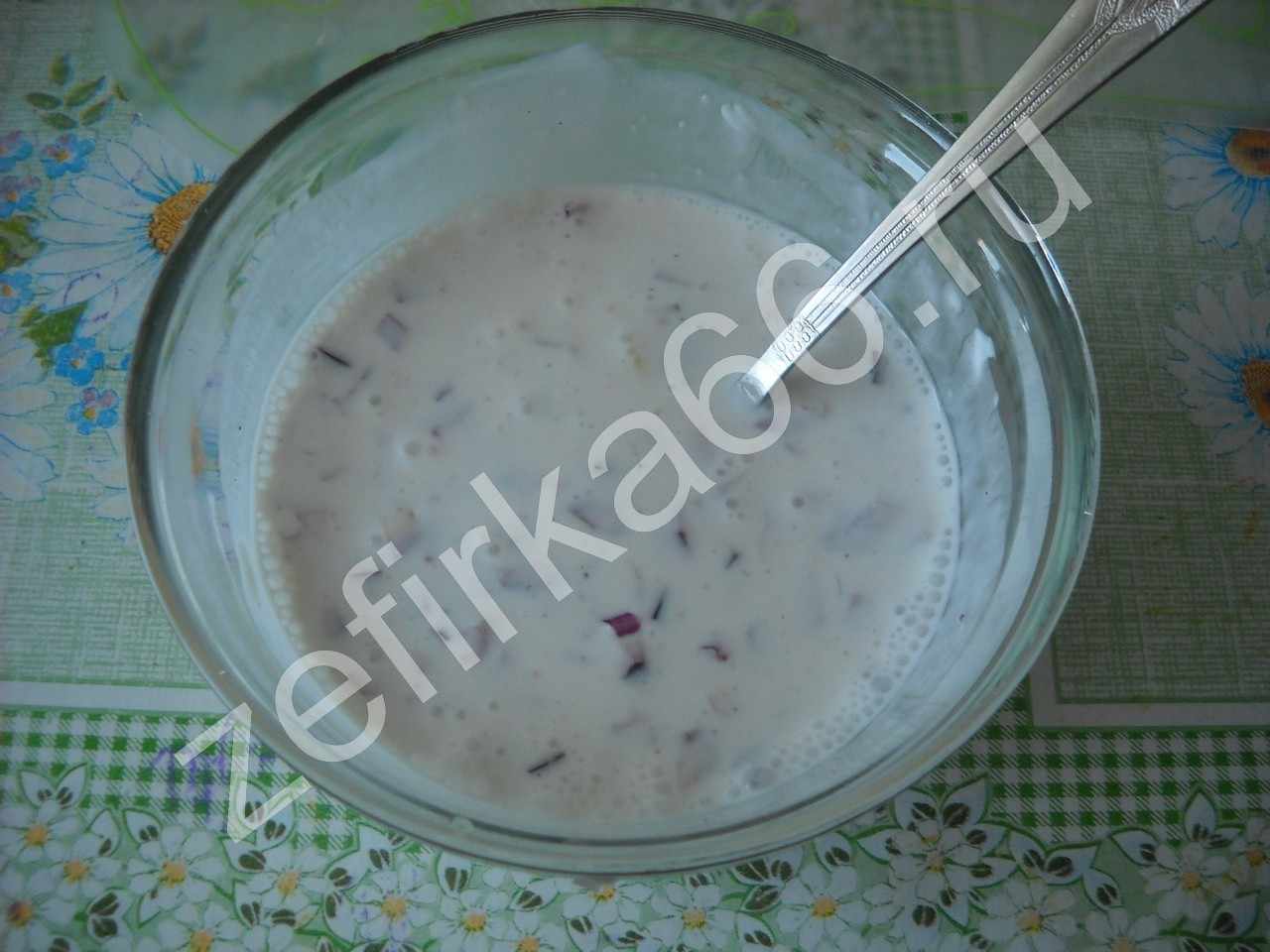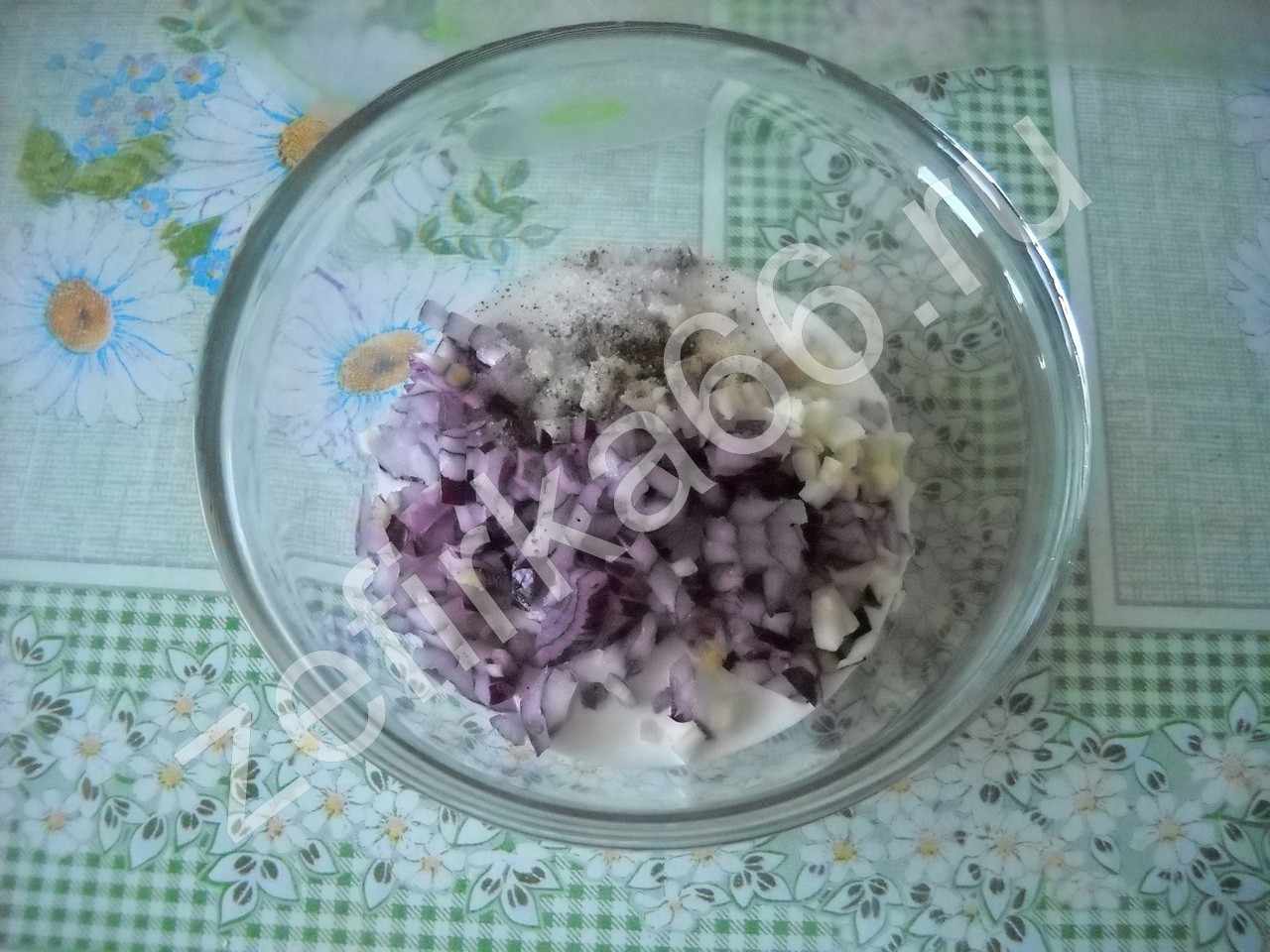 В чашке смешиваем сметану, лук, чеснок с солью и специями.