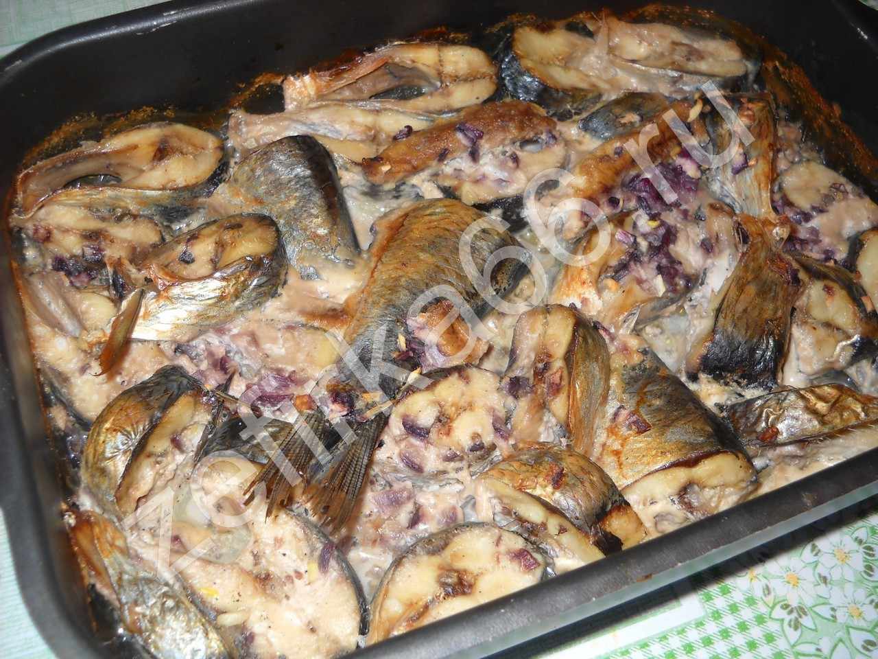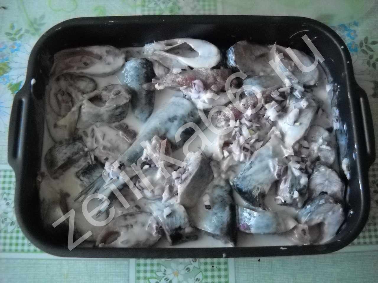 Кладем рыбу в форму для выпекания и заливаем ее приготовленным сметанным соусом, равномерно распределяя лук и чеснок по рыбе, тщательно обмазывая сметаной каждый кусочек. Не забудем положить и икру.