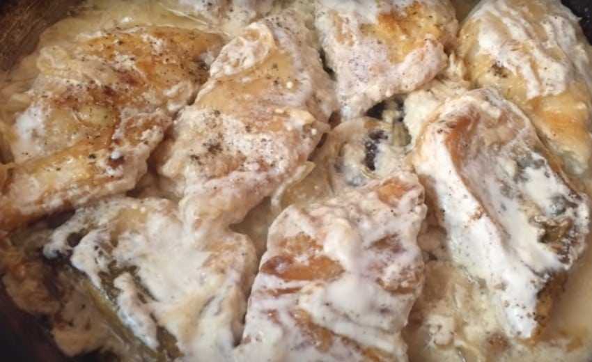 8. На сковороду с луком выложите обжаренного судака и залейте сметаной. Накройте крышкой и тушите 2-3 минуты на минимальном огне.