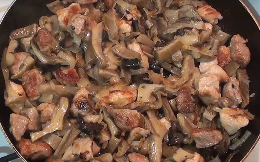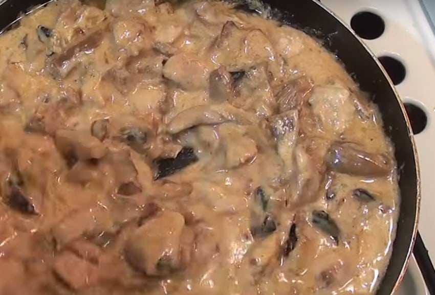 Вкусная тушеная свинина на сковороде с подливкой из сметаны и грибов