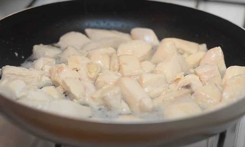 1. Порежьте крупными кубиками курятину. Поставьте на плиту сковороду, а когда она разогреется, влейте немного подсолнечного или оливкового масла. Выложите туда филе и жарьте на среднем огне, пока мясо не побелеет.