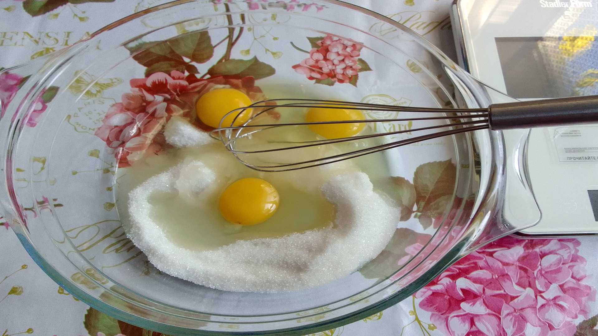 - Приготовьте базовый бисквит. Разделите белки с желтками, отдельно взбейте с сахаром. В желтки постепенно добавляйте все ингредиенты, последним – белки.