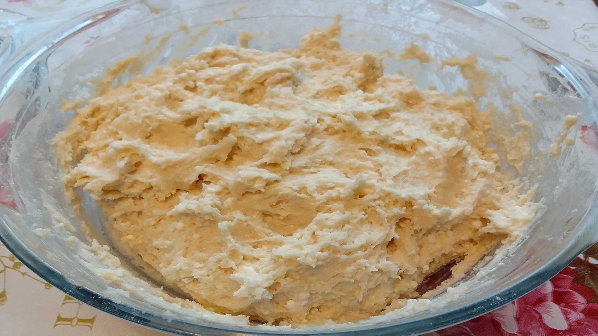 - Соедините яичную смесь с творожной. Добавьте муку и замесите тесто.