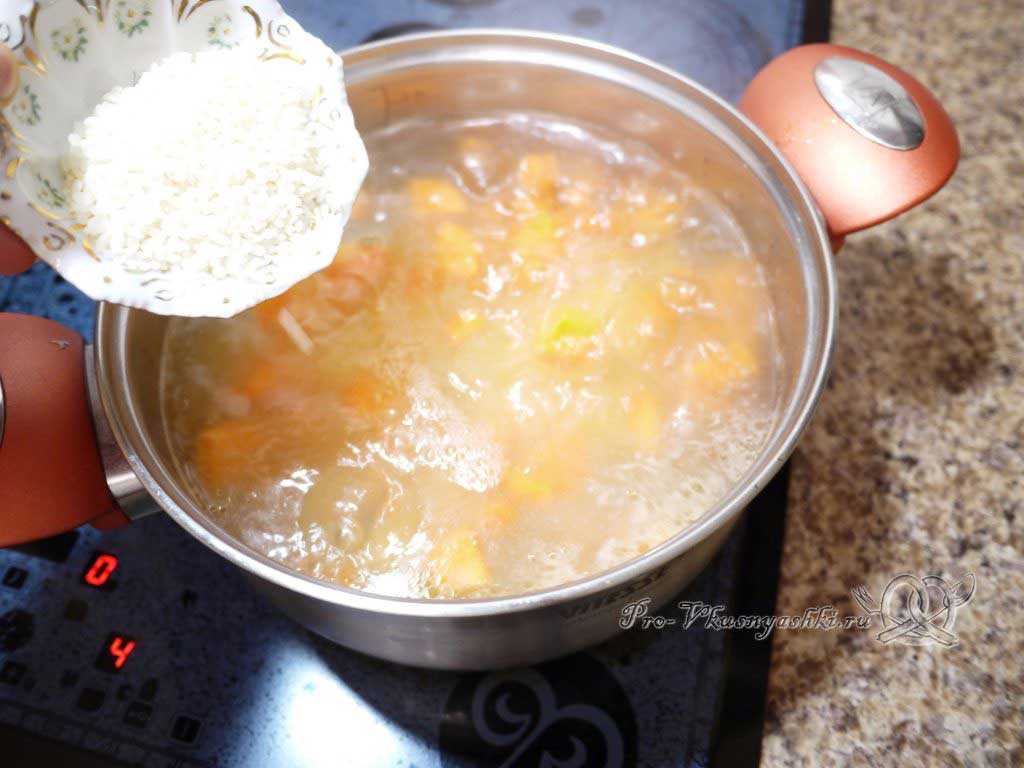 - В прозрачный бульон опускают кубики картофеля, через 10 минут добавляют промытый рис и зажарку.