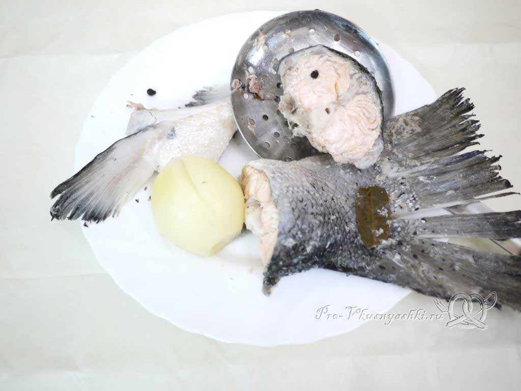 - Из подготовленных частей лосося в течение 30 минут варят бульон, затем его процеживают.