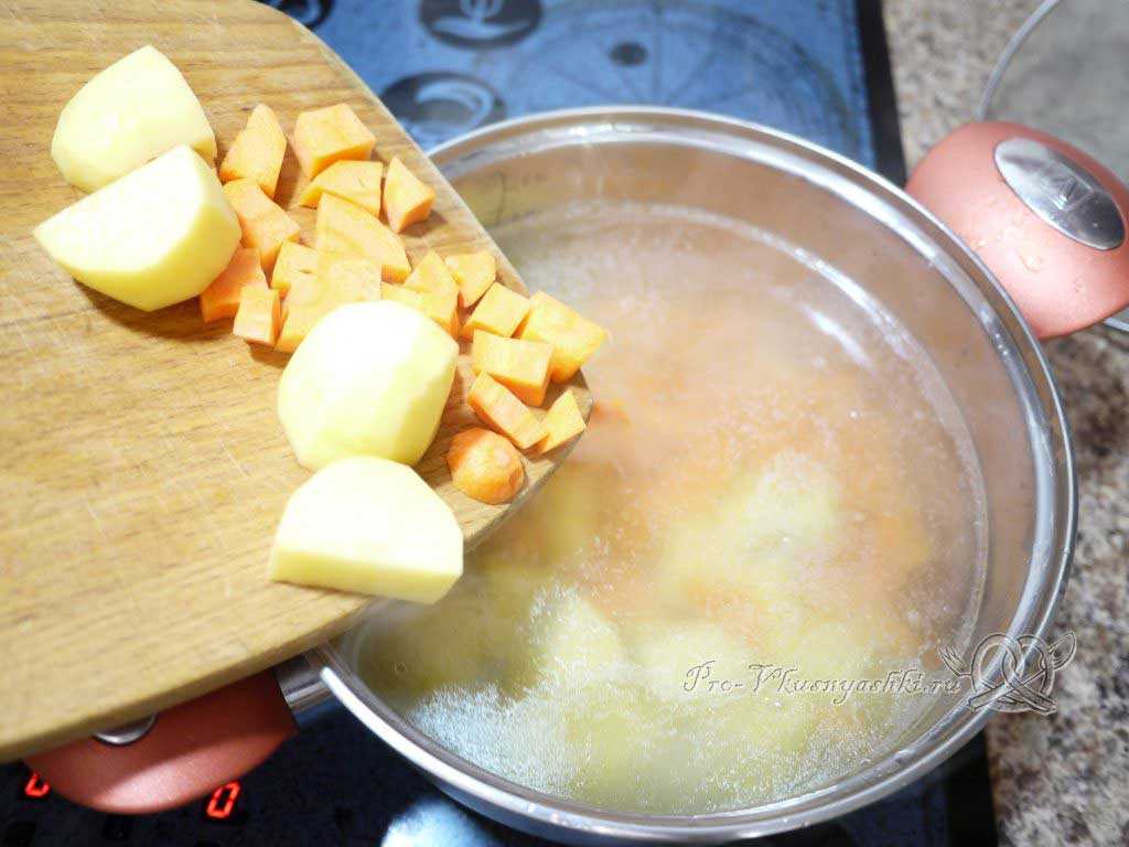 4. Бульон поставьте на огонь, добавьте в него картофель и варите до полуготовности на среднем огне. Добавьте в кастрюлю морковку.