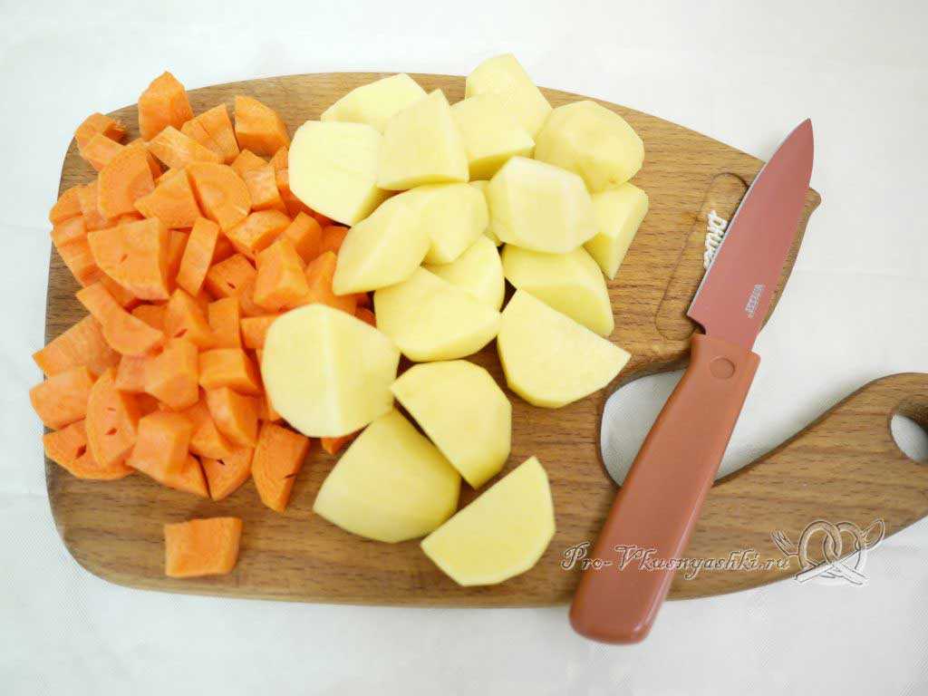 Картофель режем кубиками, морковь соломкой, лук кубиками.