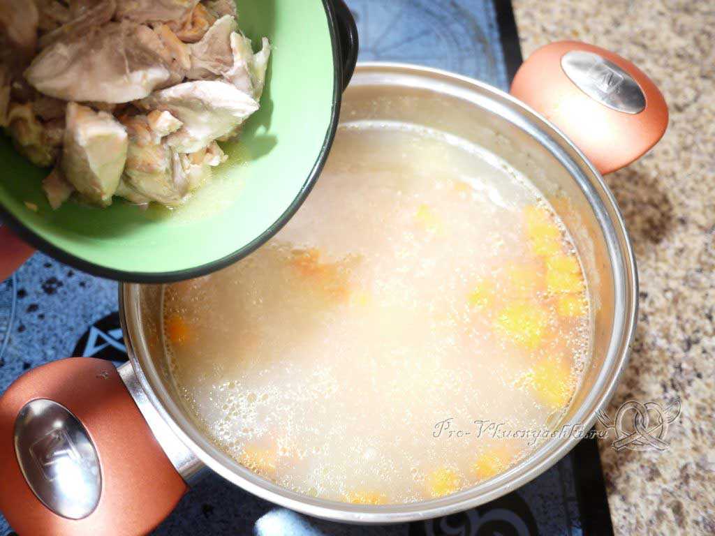 6. Когда овощи дойдут до готовности, выложите в суп кусочки мяса. Добавьте зелень, поварите 2-3 минуты и выключайте огонь. Накройте кастрюлю крышкой и дайте настояться блюду около получаса.