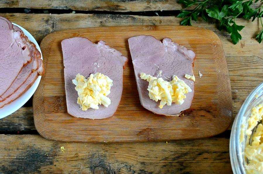 Раскладываем ветчину и на каждый ломтик выкладываем по одной столовой ложки приготовленной начинки.