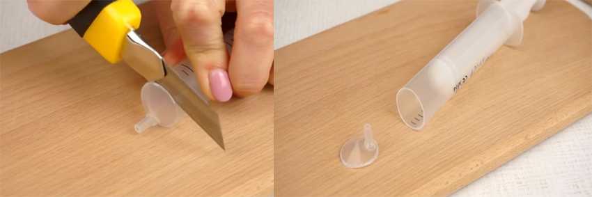 Далее проделайте следующее. Возьмите шприц на 50 мл. Для вас это неожиданно? В составе продуктов шприцев нет. Сейчас расскажу, зачем он нужен. Удалите иголку, выкиньте. Отодвиньте внутреннюю часть шприца наружу. Тупой конец, откуда производятся инъекции, срежьте канцелярским ножом. У вас получилось? Отлично! Теперь у вас имеется универсальный инструмент для приготовления канапе в домашних условиях!