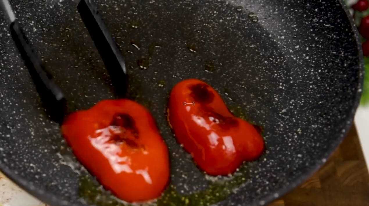Держим перец на огне пару минут – дождемся темной корочки на его кожице и снимаем с плиты. Наш перец должен быть мягким, сочным после прожарки.