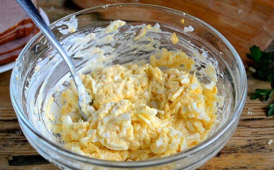 Сыр и чеснок натираем мелко, соединяем с ранее подготовленными яйцами, добавляем к ним майонез, при необходимости солим. Готовим густую пасту для начинки, которая не будет вытекать.