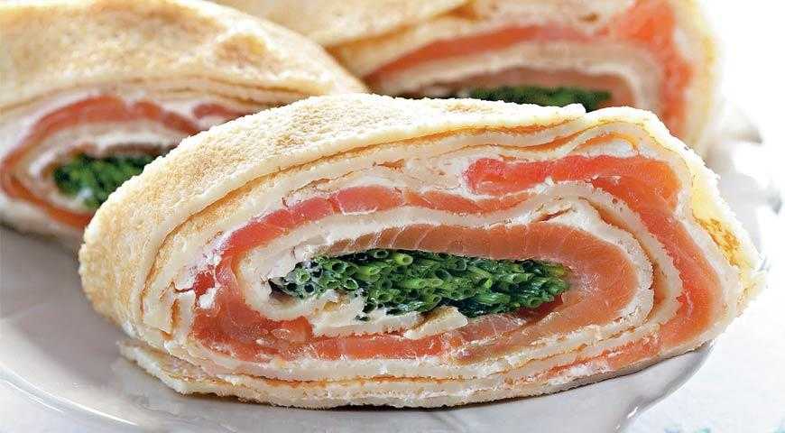 Последний лист нужно смазать майонезом и выложить на него тонкие слайсы рыбы. Аккуратно сверните плотный рулет и оберните его пищевой пленкой. Оставьте в холодильнике на 2 часа и можно подавать. Нарезать нужно острым и смоченным в воде ножом.