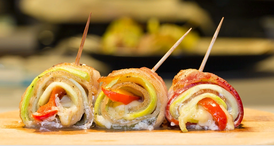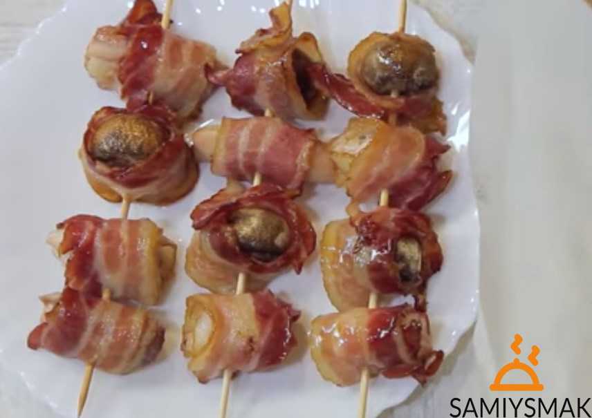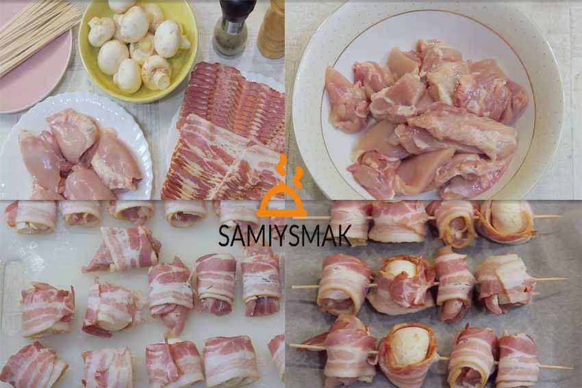 Думаю, самая вкусная закуска для праздничного стола – рулетики в беконе. Начинкой послужит мясо курицы и свежие шампиньоны. Быстро готовится, потратите всего 10-12 минут. Для запекания еще 20 минут.