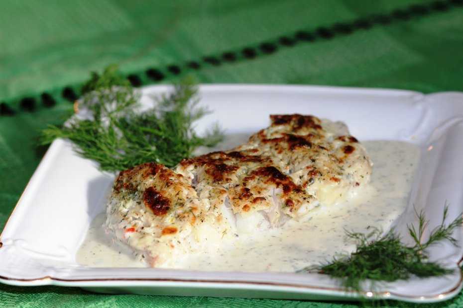 Залейте рыбное блюдо чесночно-сливочным соусом и можно ставить в духовку для запекания.