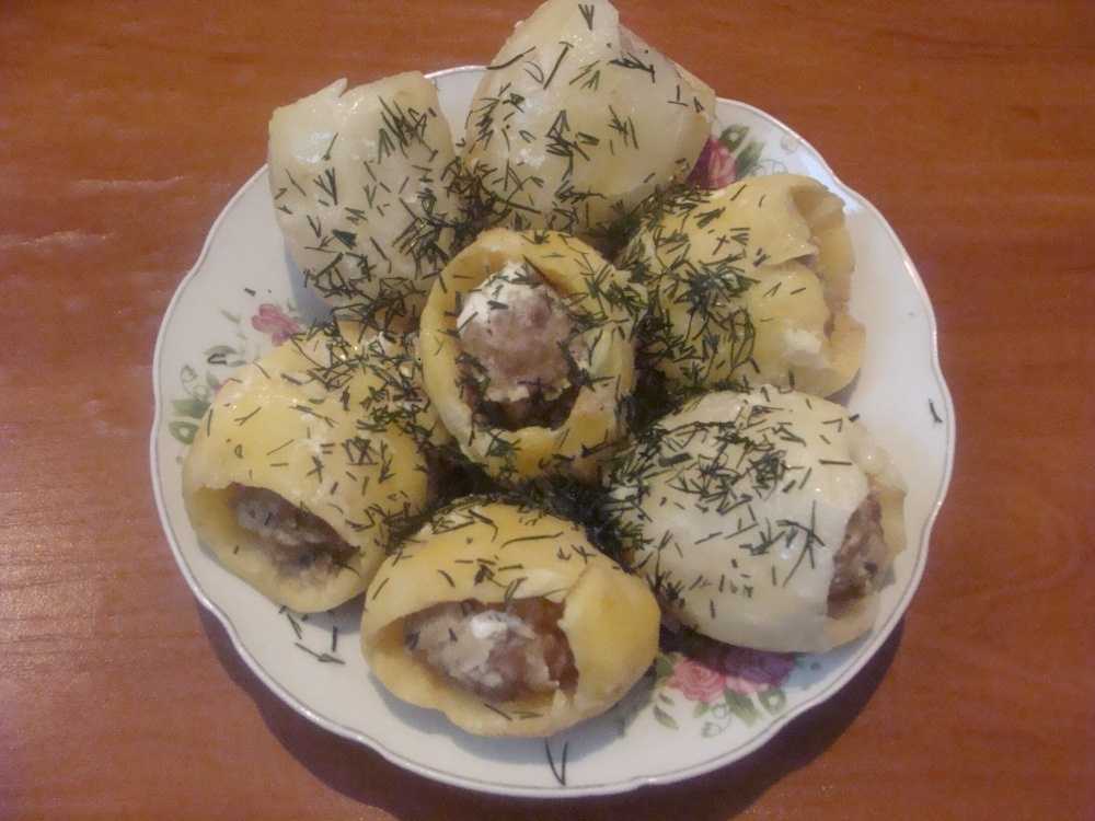 Хорошо вымытые картофелины с кожурой выпекают в духовке. Срезают с них верхушку. Чайной ложкой выбирают из картофеля середину так, чтобы стенки картофеля были толщиной 1 см. С картофелин снимают кожицу. Картофельную массу смешивают с грибным и мясным фаршем, желтком, 2-мя ст. ложками сметаны, специями. Туда добавляют взбитый белок, перемешивают. Середину картофелин подсаливают и заполняют картофельно-мясной массой. Картошку, фаршированную фаршем и грибами, ставят в духовку на противне, поливают остатками сметаны, размешанной с желтком, и подрумянивают. Подают приготовленную по этому рецепту картошку, фаршированную грибами, с салатом.